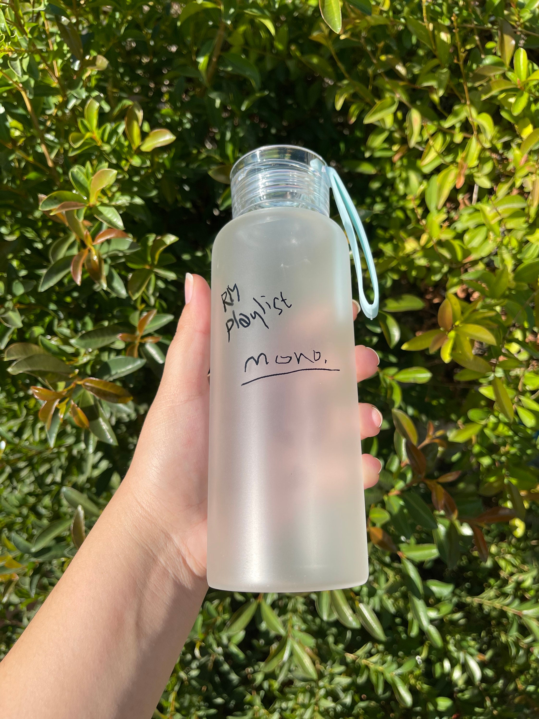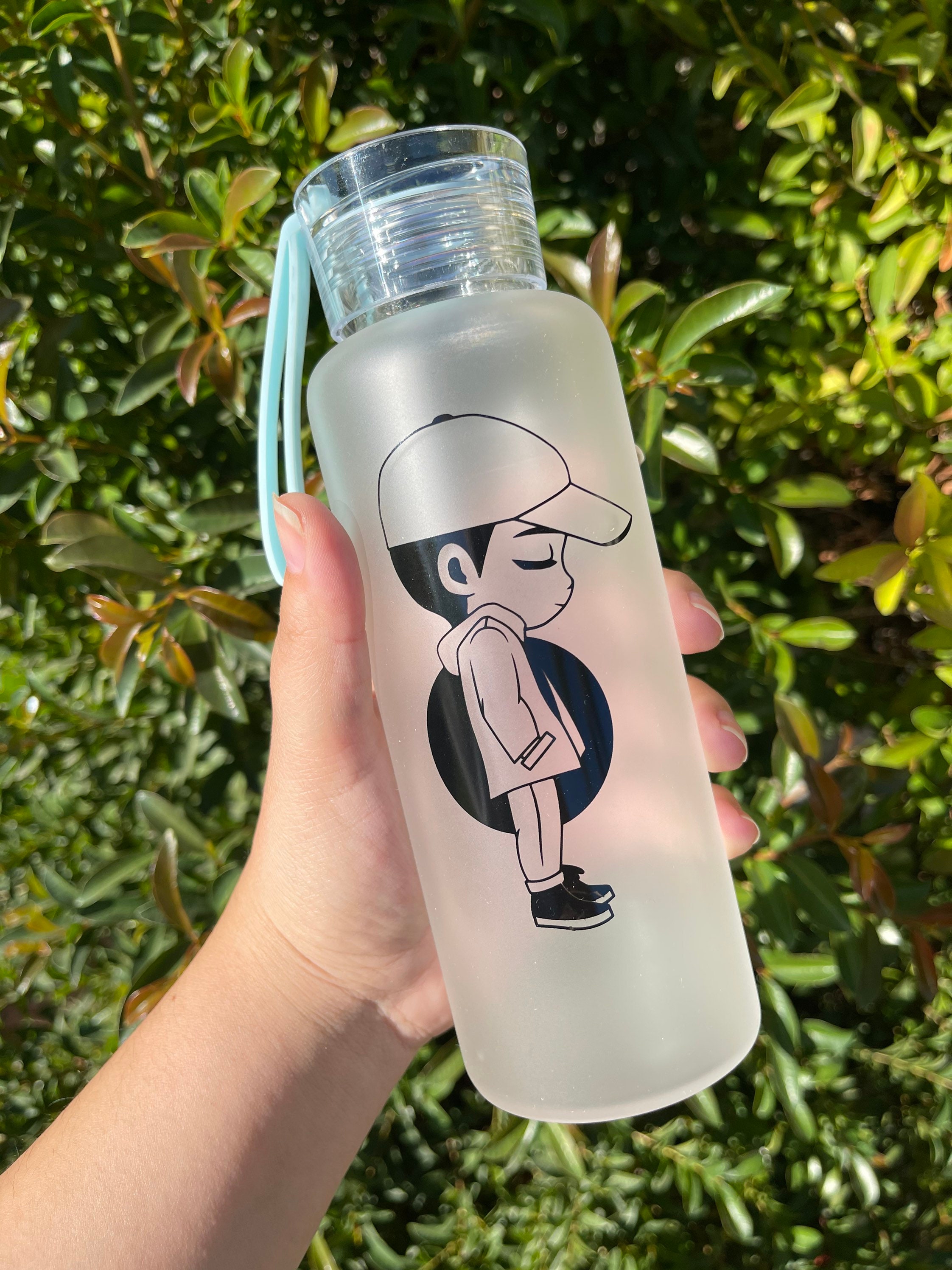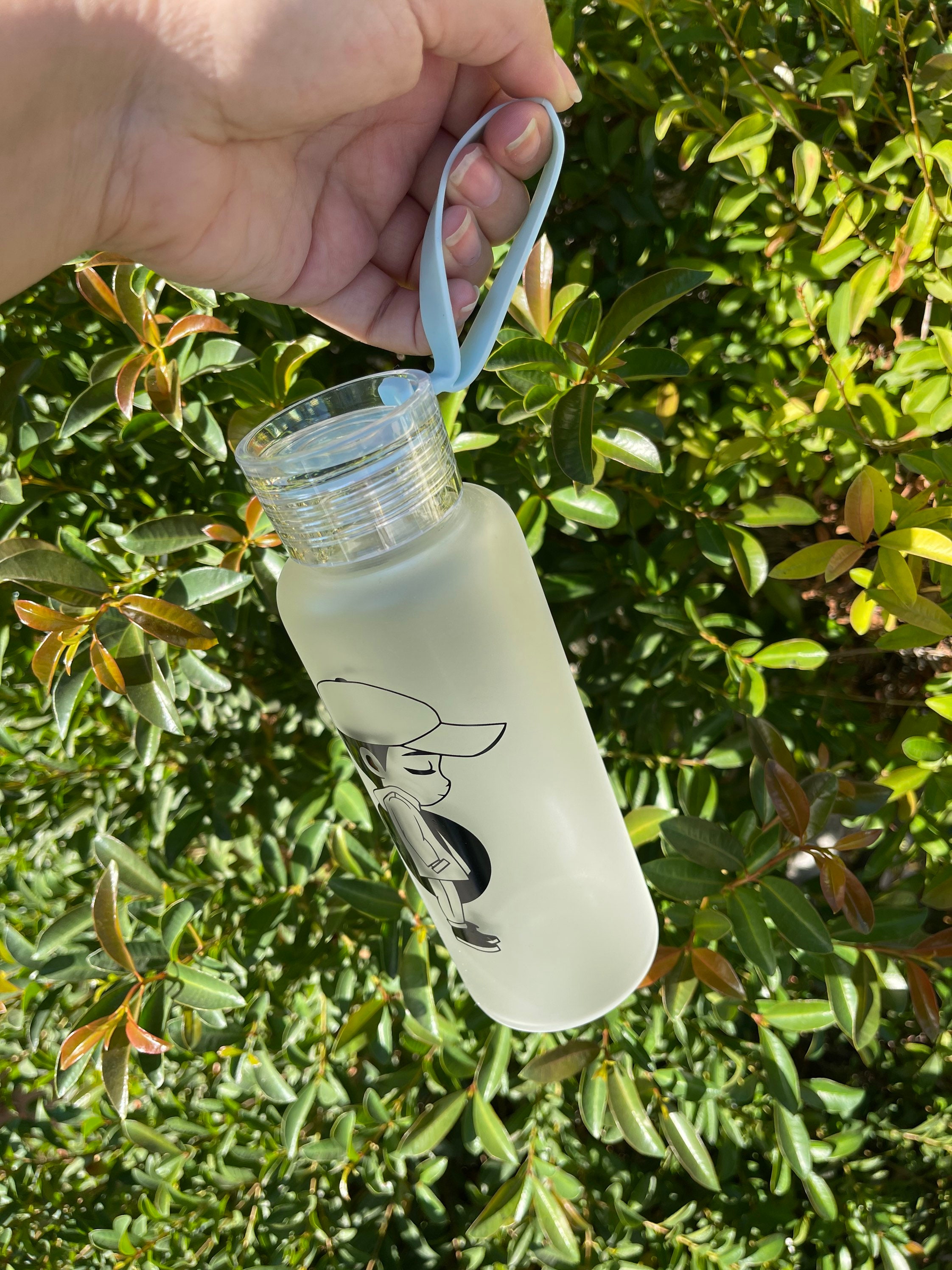 Water bottle is made of glass and has a screw cap and blue silicone holder to easily carry with you anywhere you go!