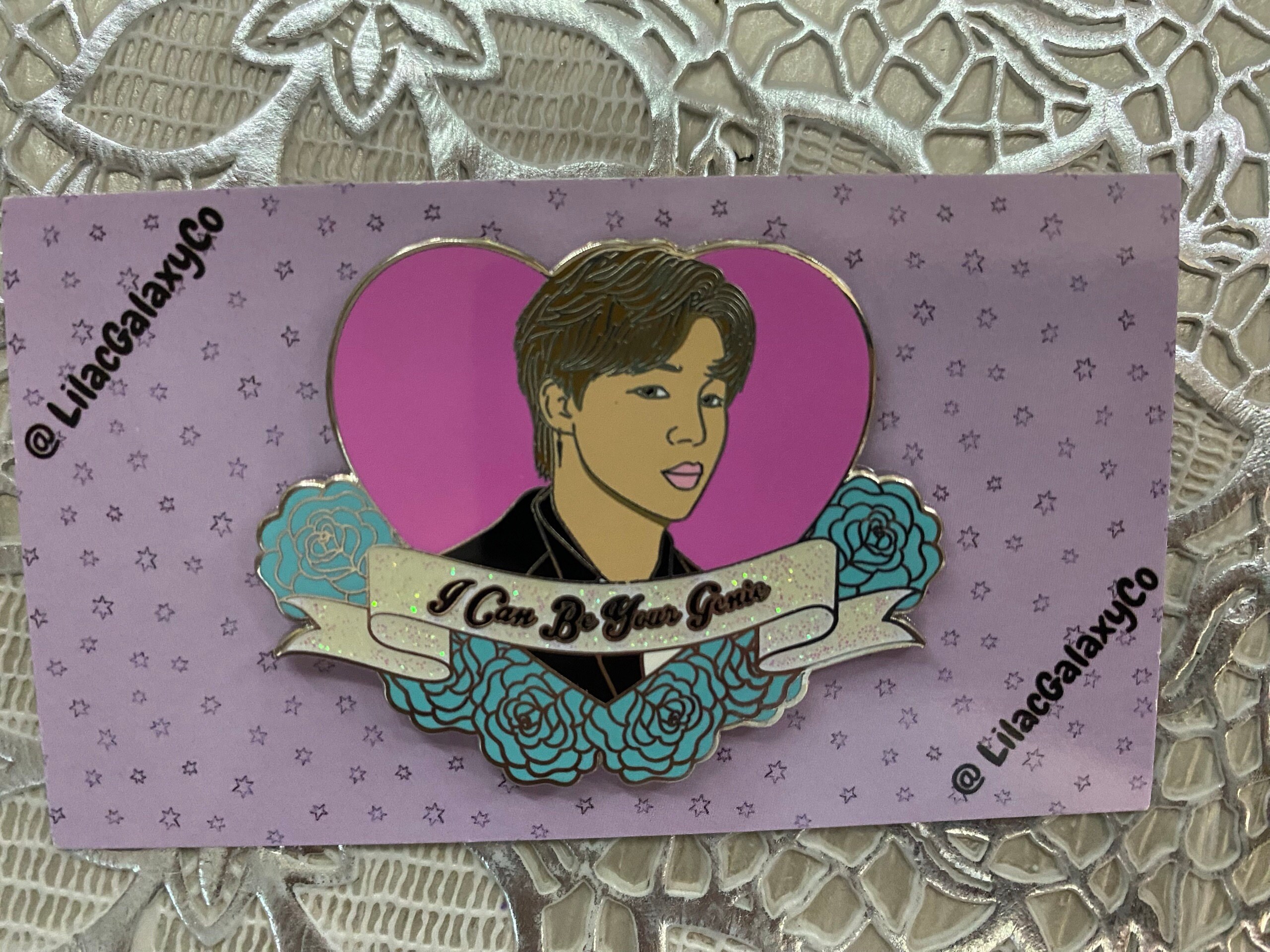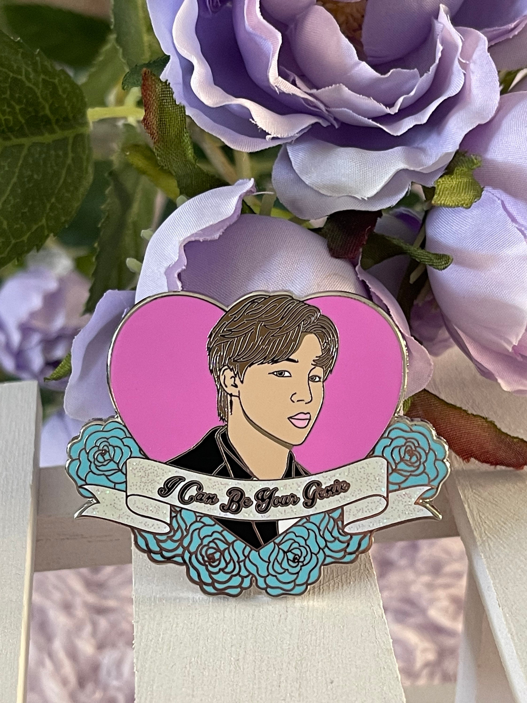 Welcome to our Bangtan Valentine Enamel Pin Series! Pin 5 out of 7 is our lovely Jimin! This listing is for a BTS enamel pin featuring a sweet message from Jimin. Placed in a heart with flowers surrounding the bottom and a banner that says “I Can Be Your Genie” - inspired by the lyrics of his sweet solo song, “Filter” on the Map of the Soul 7 album! This pin is a perfect way to show your love for BTS and Jimin’s sweet message.