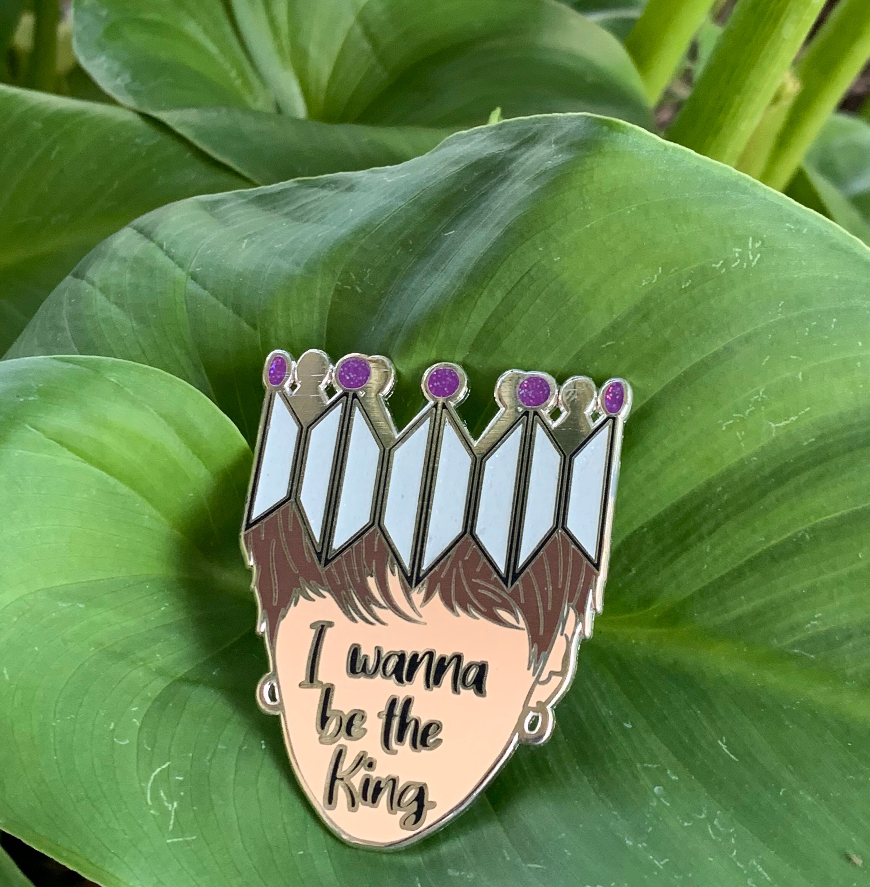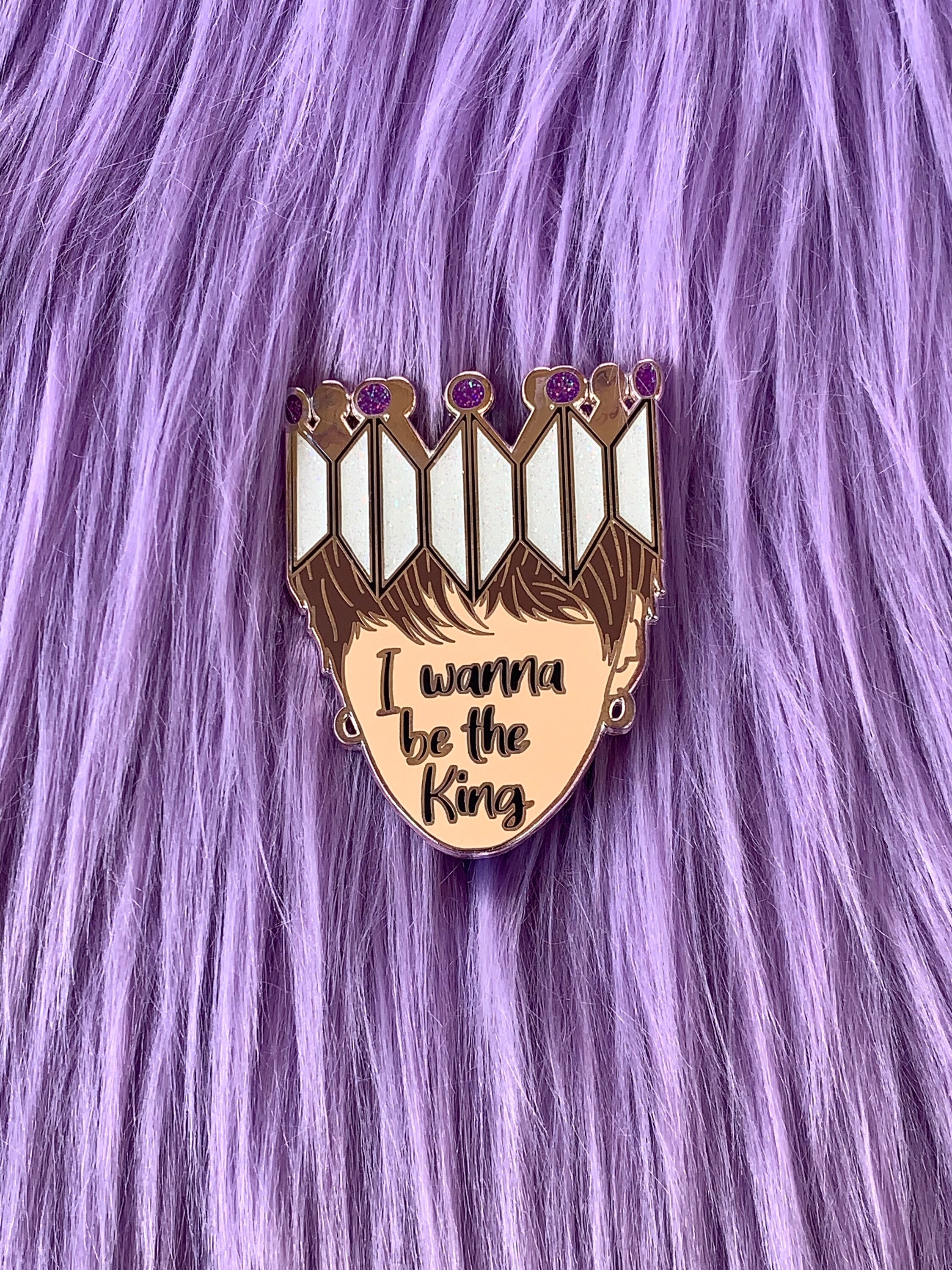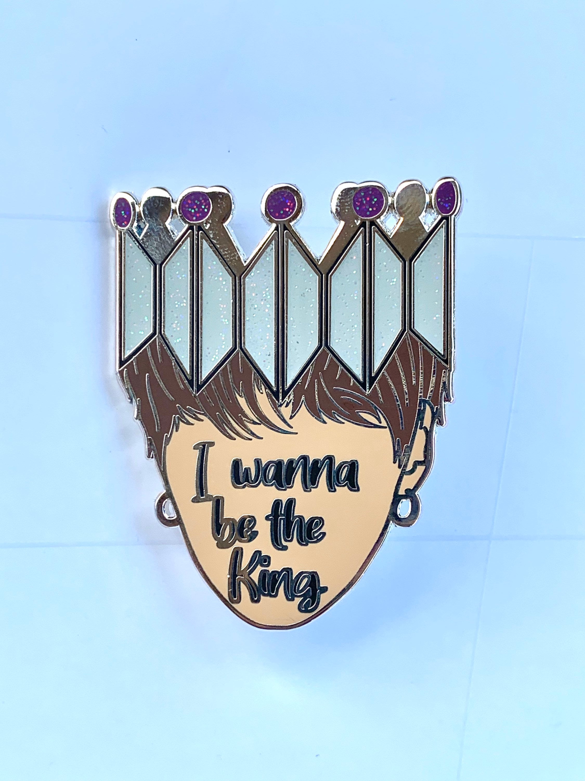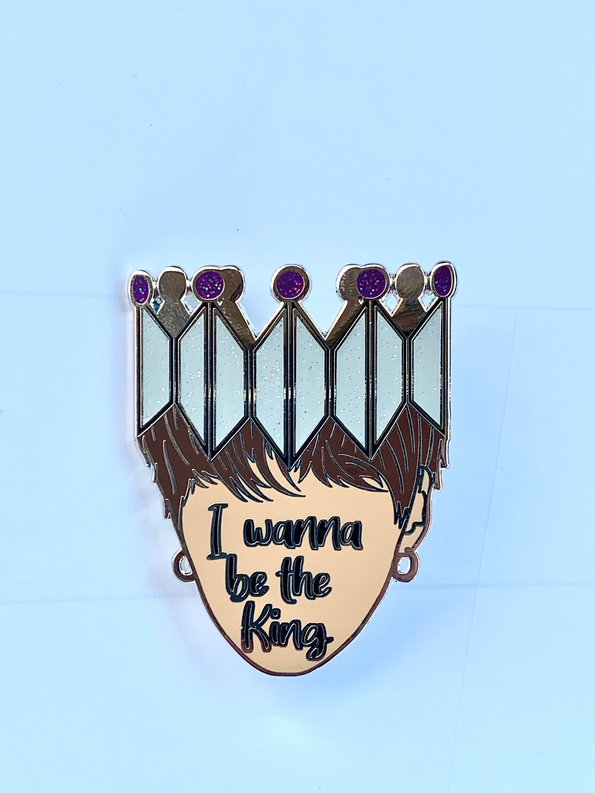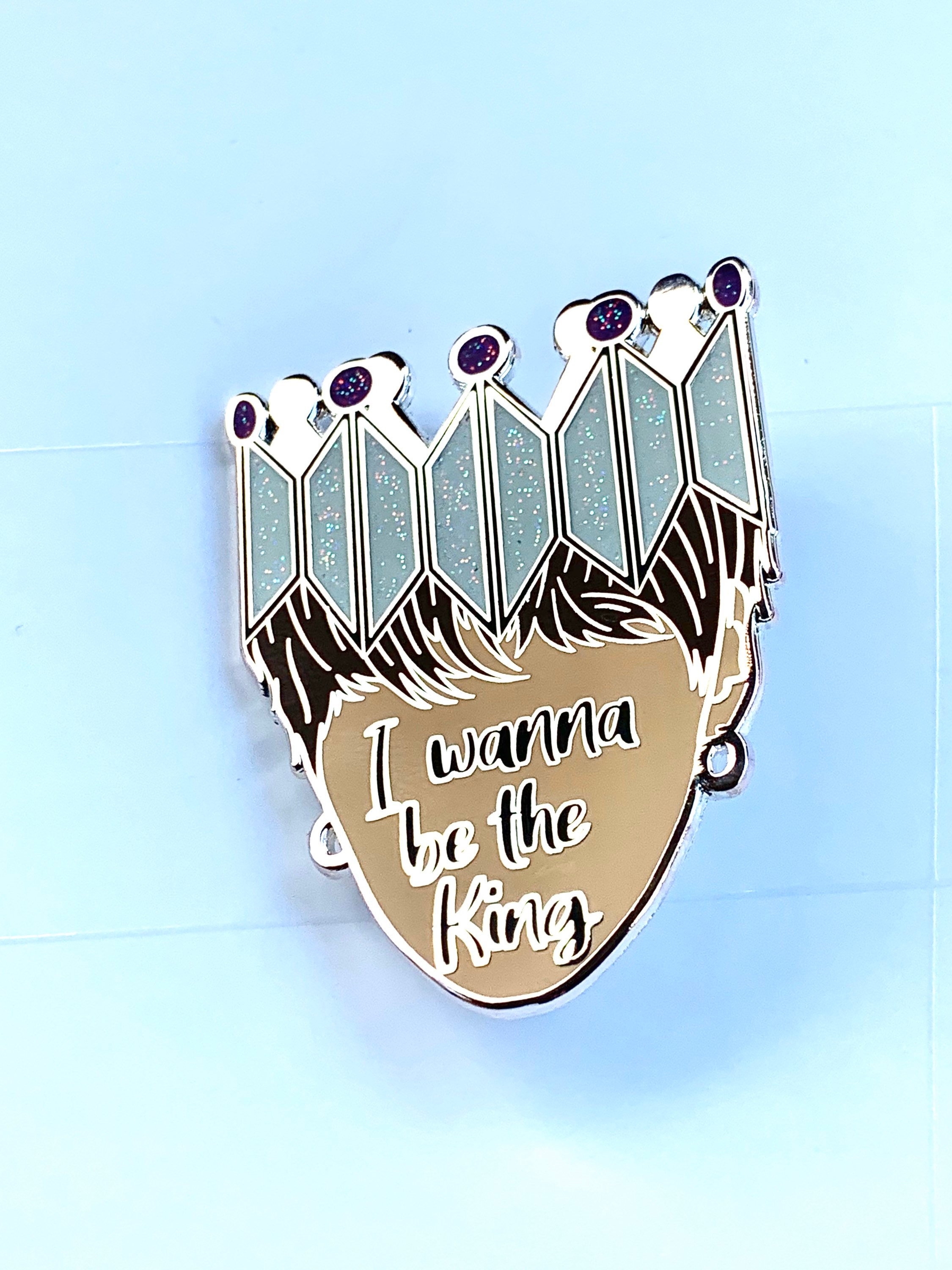 Hard enamel pin inspired by BTS’s song Interlude Shadow. Beautiful silver crown shows off the BTS and Army symbols, an outline of Yoongi (aka Suga ‘s) face that states “I wanna be the King.” Measures 2 inches tall and 1.58 inches long. Silver plating. Rubber backings