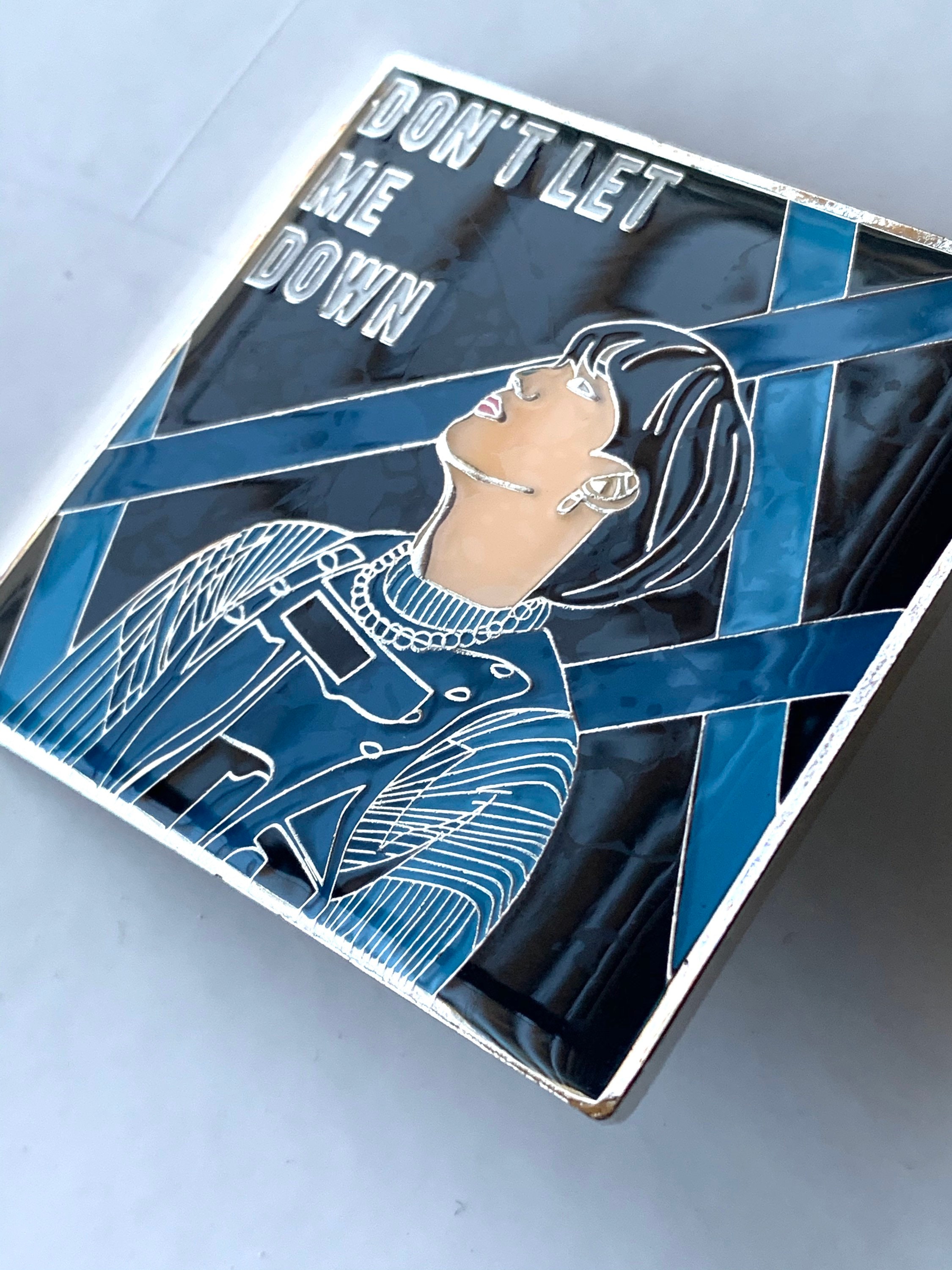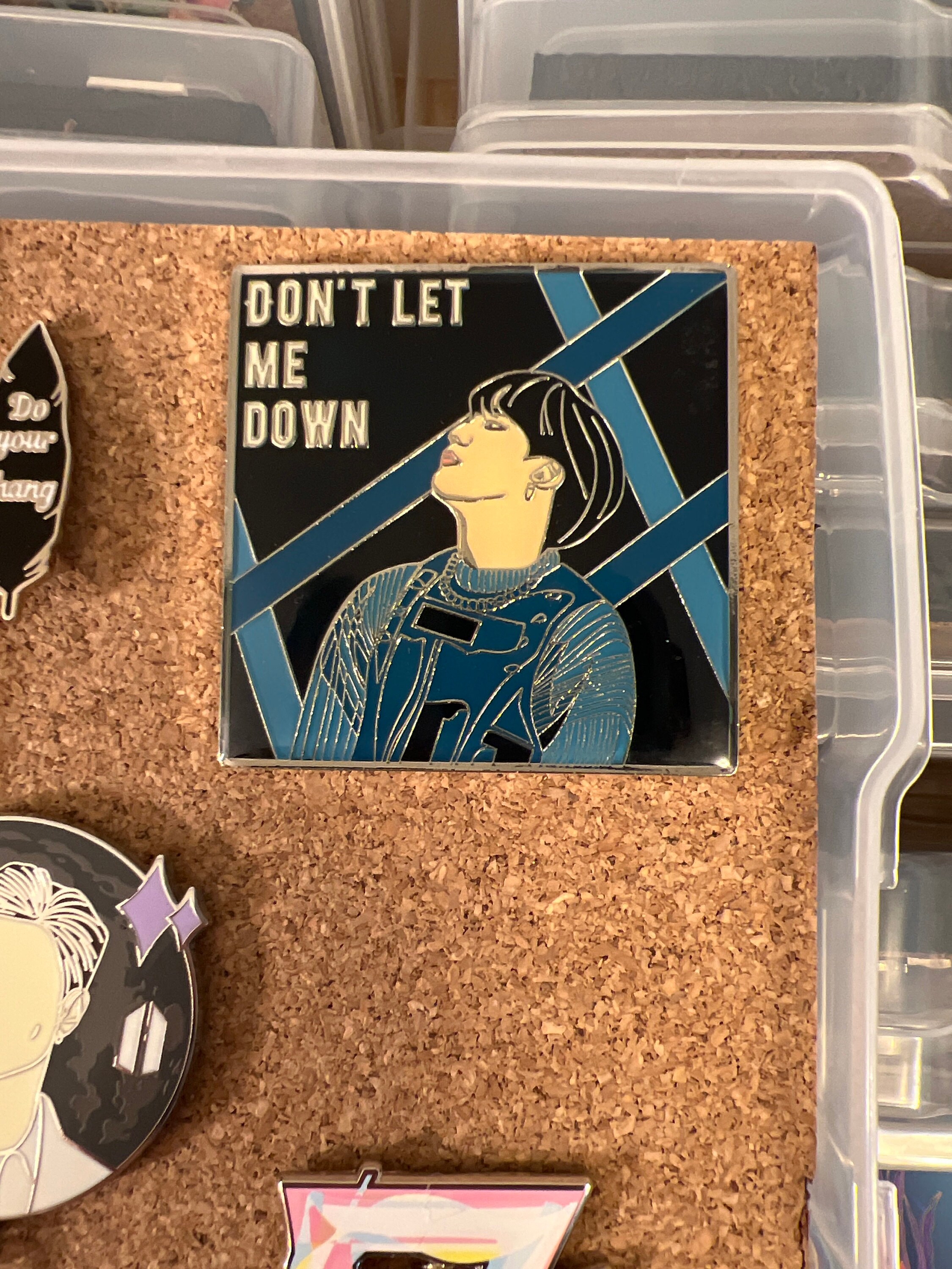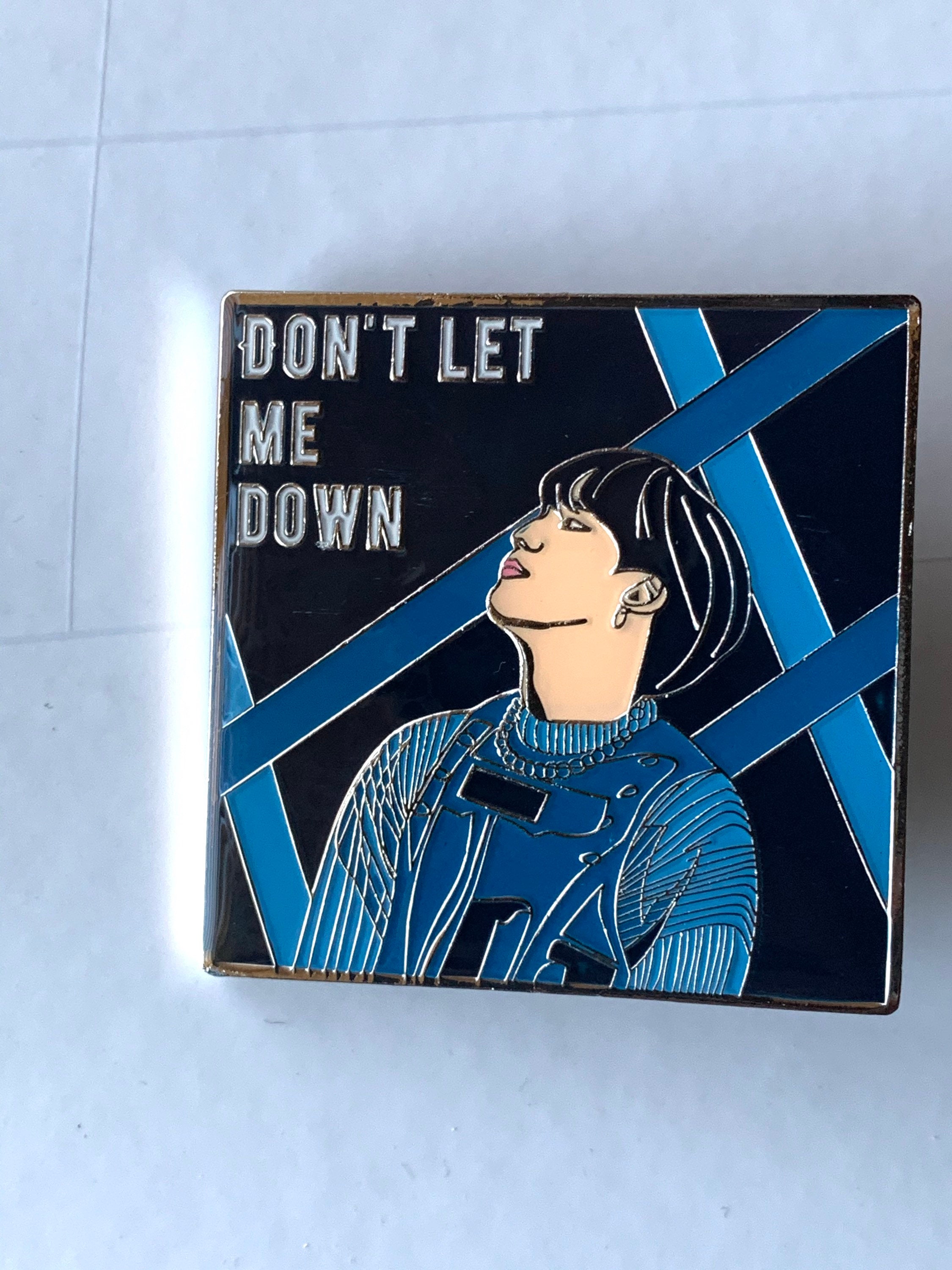 Enamel pin inspired by BTS’s song Interlude Shadow. Features Yoongi (aka Suga ) in the spotlight staring up at the wording “Don’t Let me Down”. Measures 2 inches tall and 2 inches long. Silver plating. Soft enamel with epoxy resin coating Butterfly clutch backing Shop name stamped on back Grade: Seconds