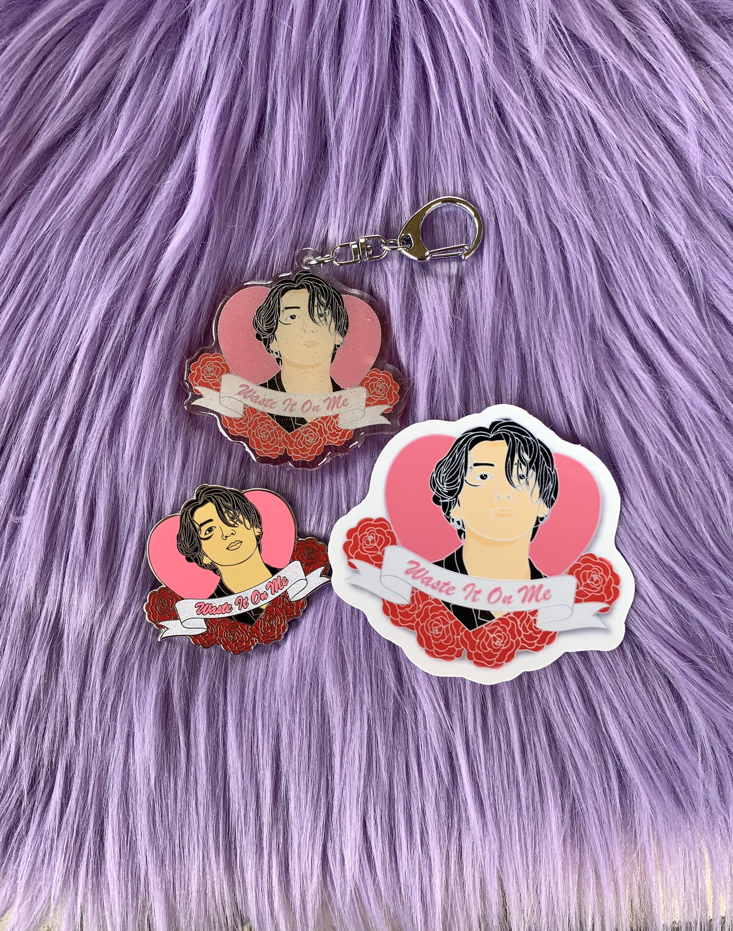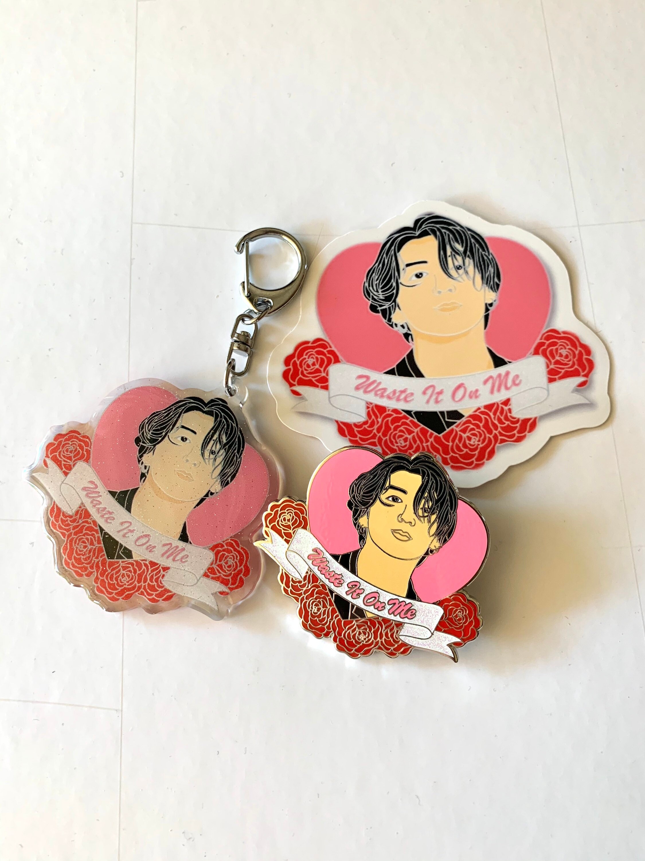 3 piece bundle perfect for any Jungkook stan! Comes with a hard enamel pin, keychain and sticker. The design features a sweet message from Jungkook. Placed in a heart with flowers surrounding the bottom and a banner that states a part of their song or something they’re known for saying. Pin Measures about 1.5 inches tall and 2 inches long. Silver plating Rubber backings Shop name stamped on back