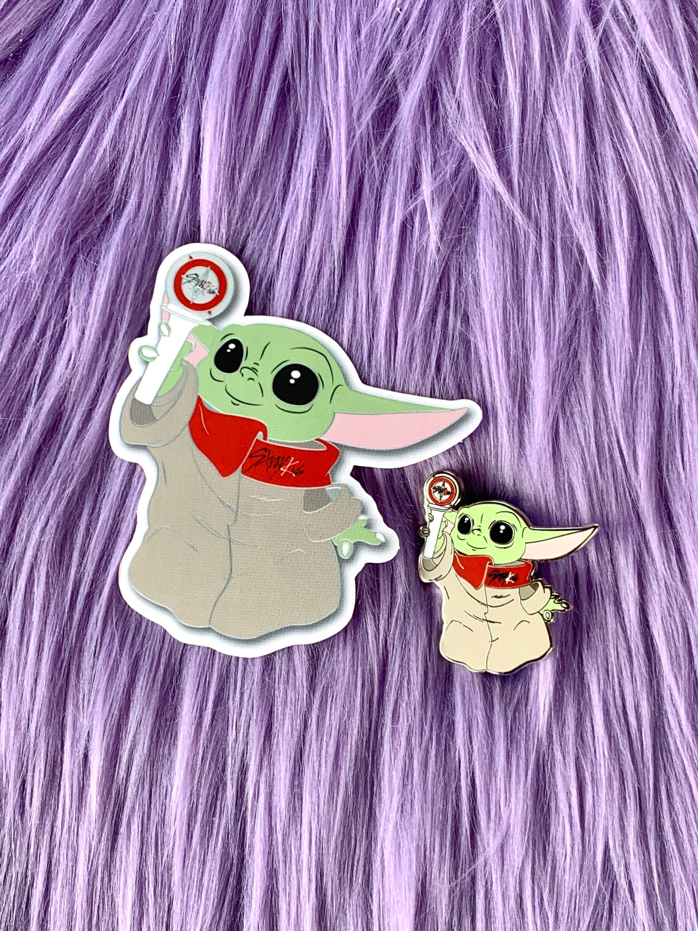 This unique enamel pin and sticker design combines two of the most popular fandoms - Kpop and Star Wars (or grogu fan)! Featuring a cute Baby Yoda with a Stray Kids twist, this set is perfect for fans of both genres.