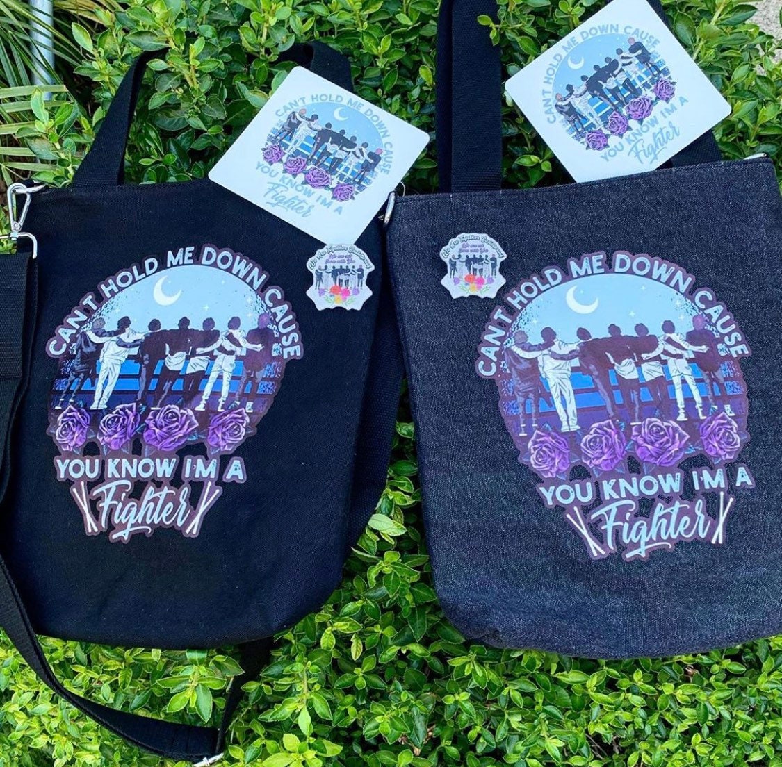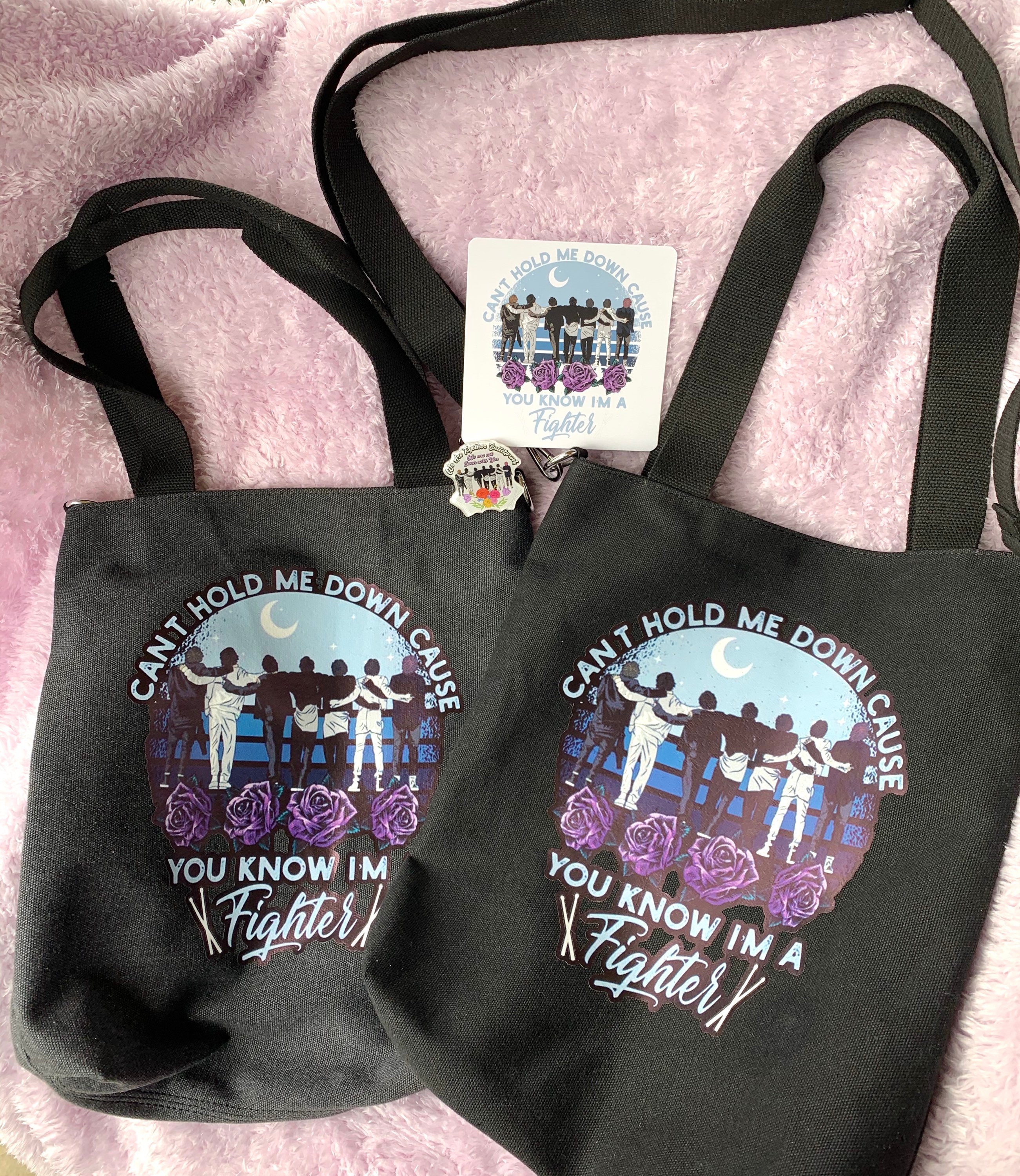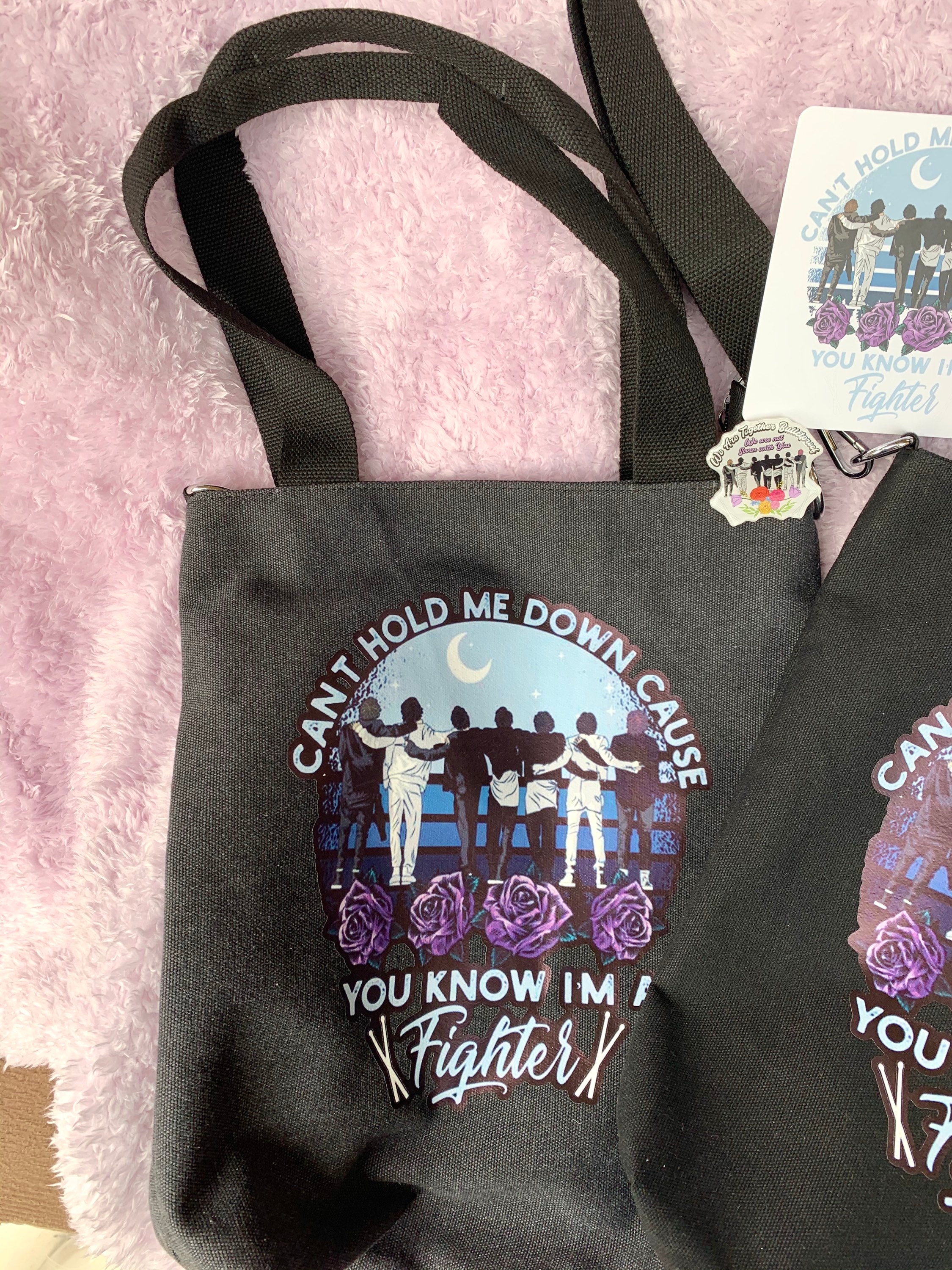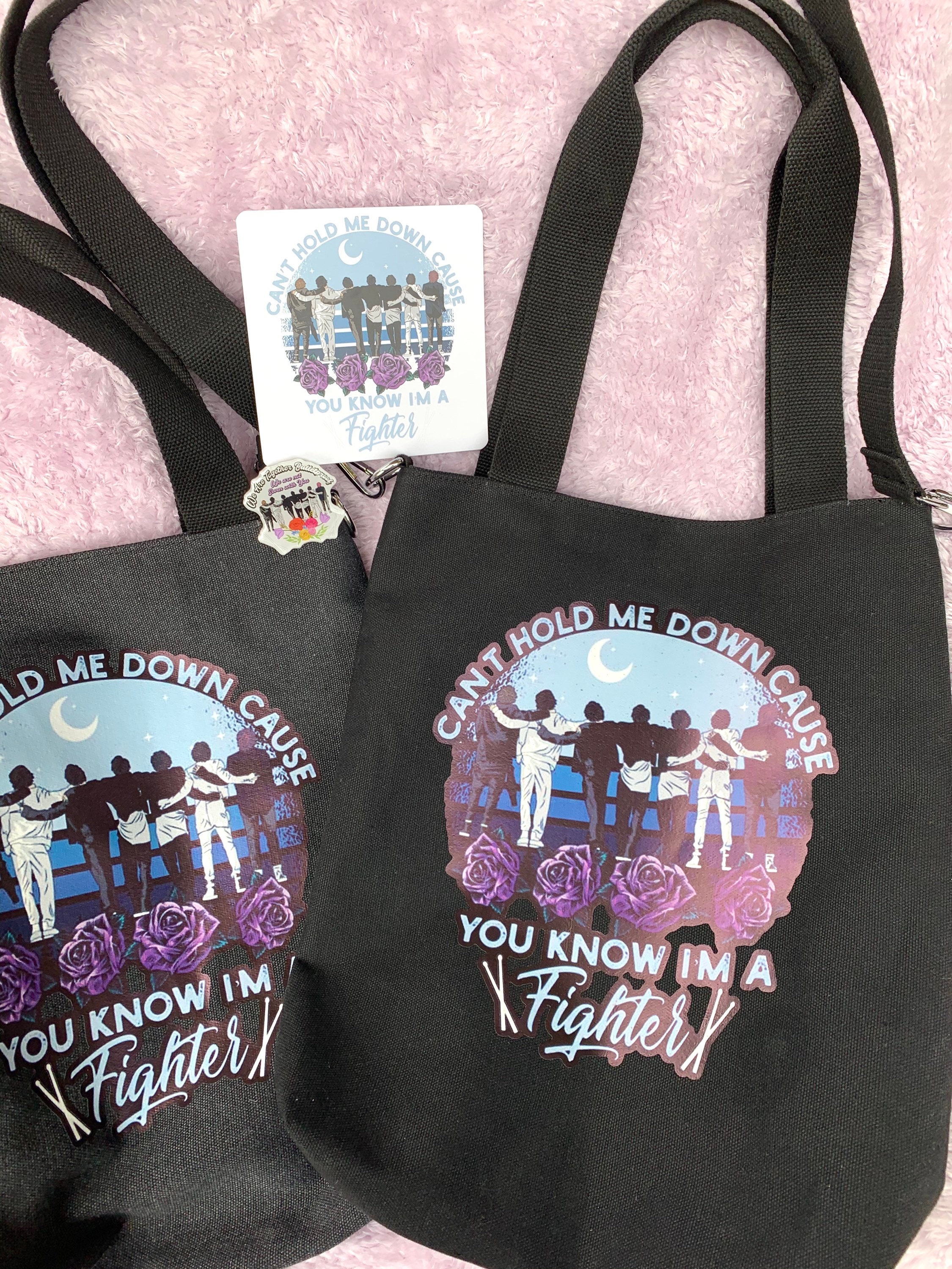 Adorable merch featuring BTS and lyrics from the song ON. The pin features lyrics from WAB the eternal. Tote bags are available in Solid Black and Vintage Black, measure 12.5 inches wide and 15 inches tall and are made from a strong/durable canvas material so you can carry heavy things without worrying about it ripping.They have a zippered pocket on the back outside of the bag and inside the bag, and 2 slot pockets. It has a zipper to close it and keep all your items safe inside and comes with an additional adjustable woven strap so you can wear it as a crossbody bag and carry heavier items easily.
