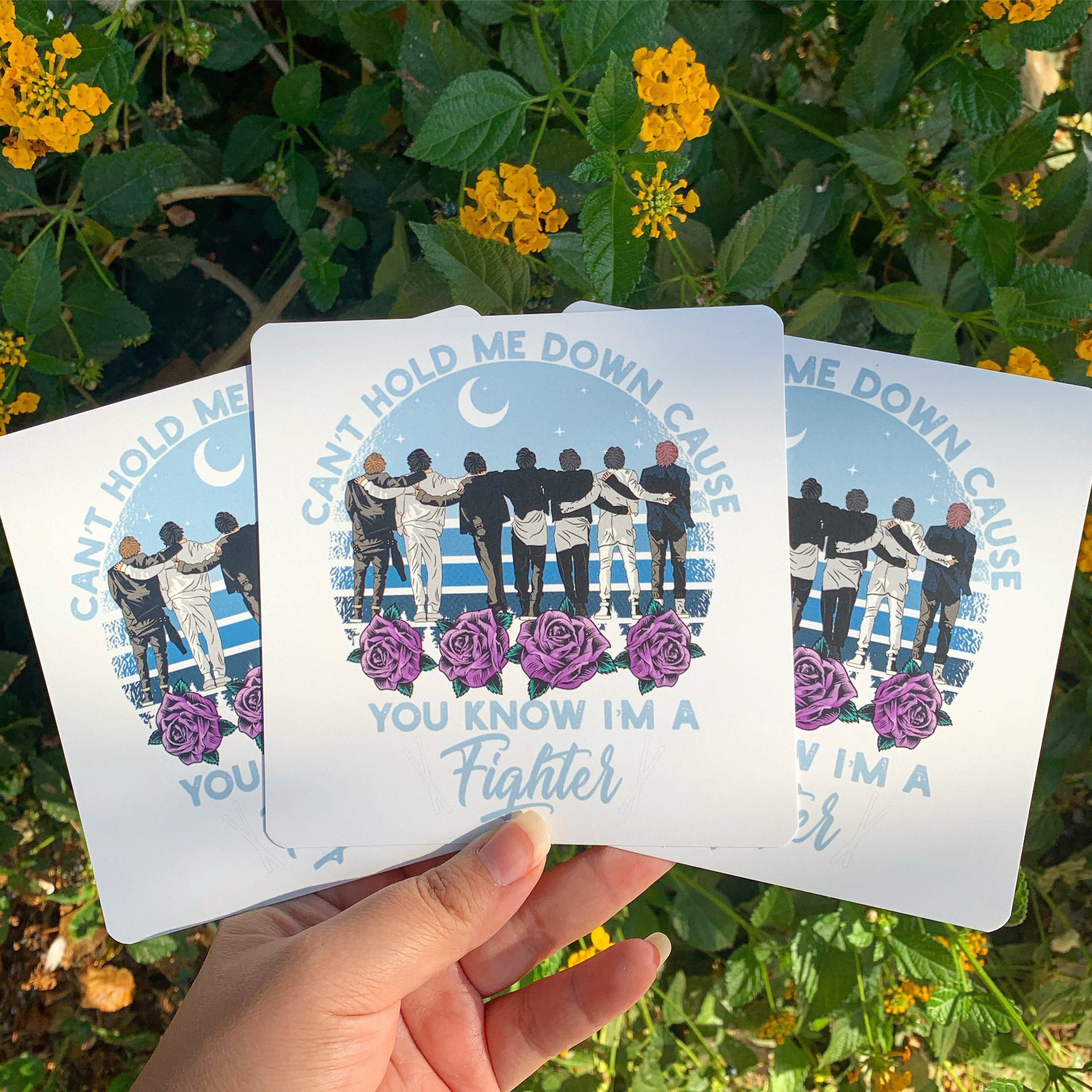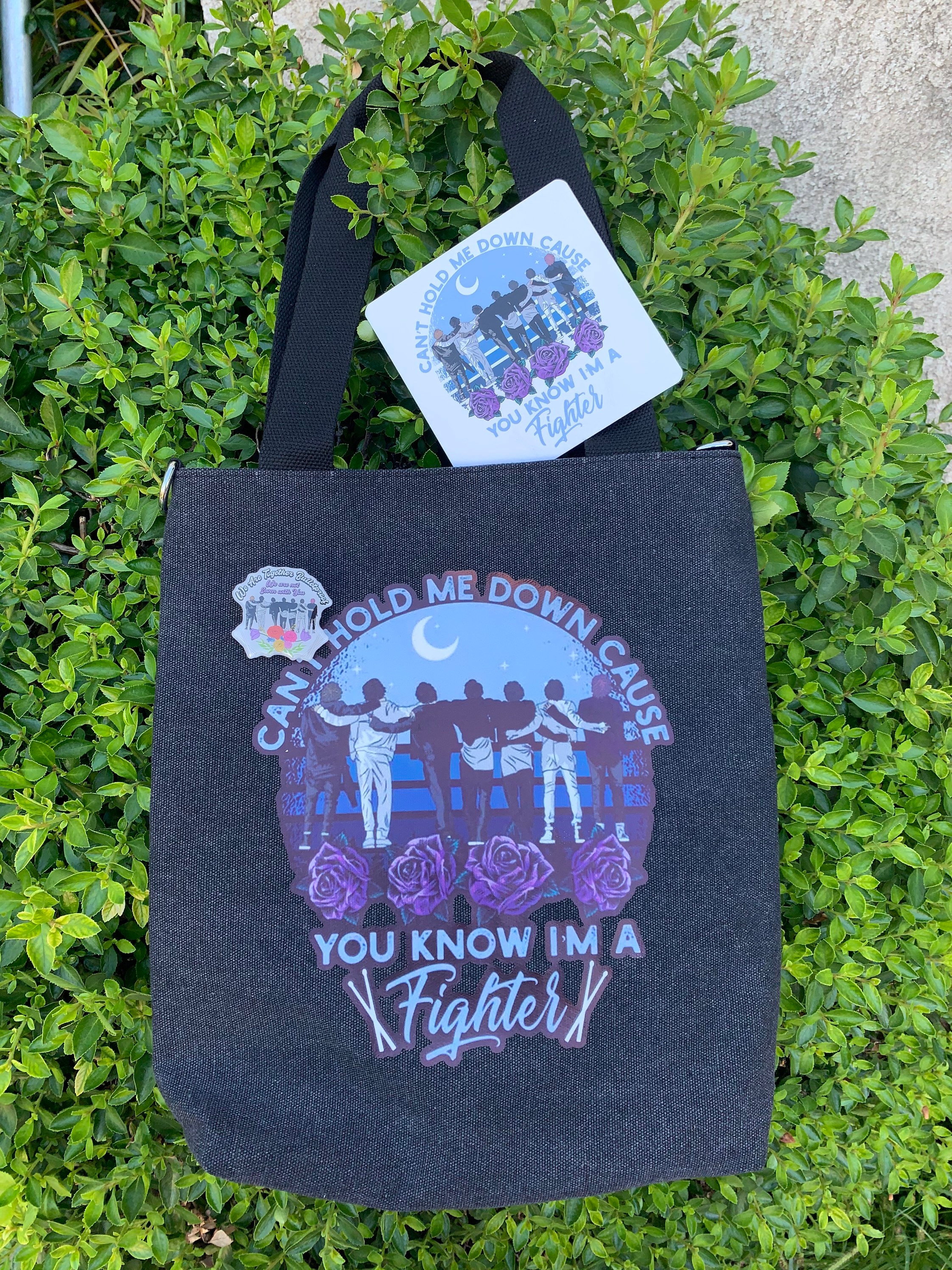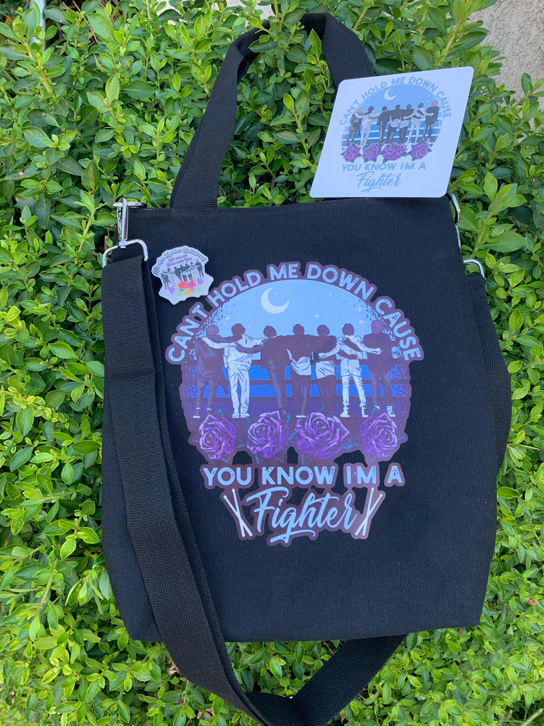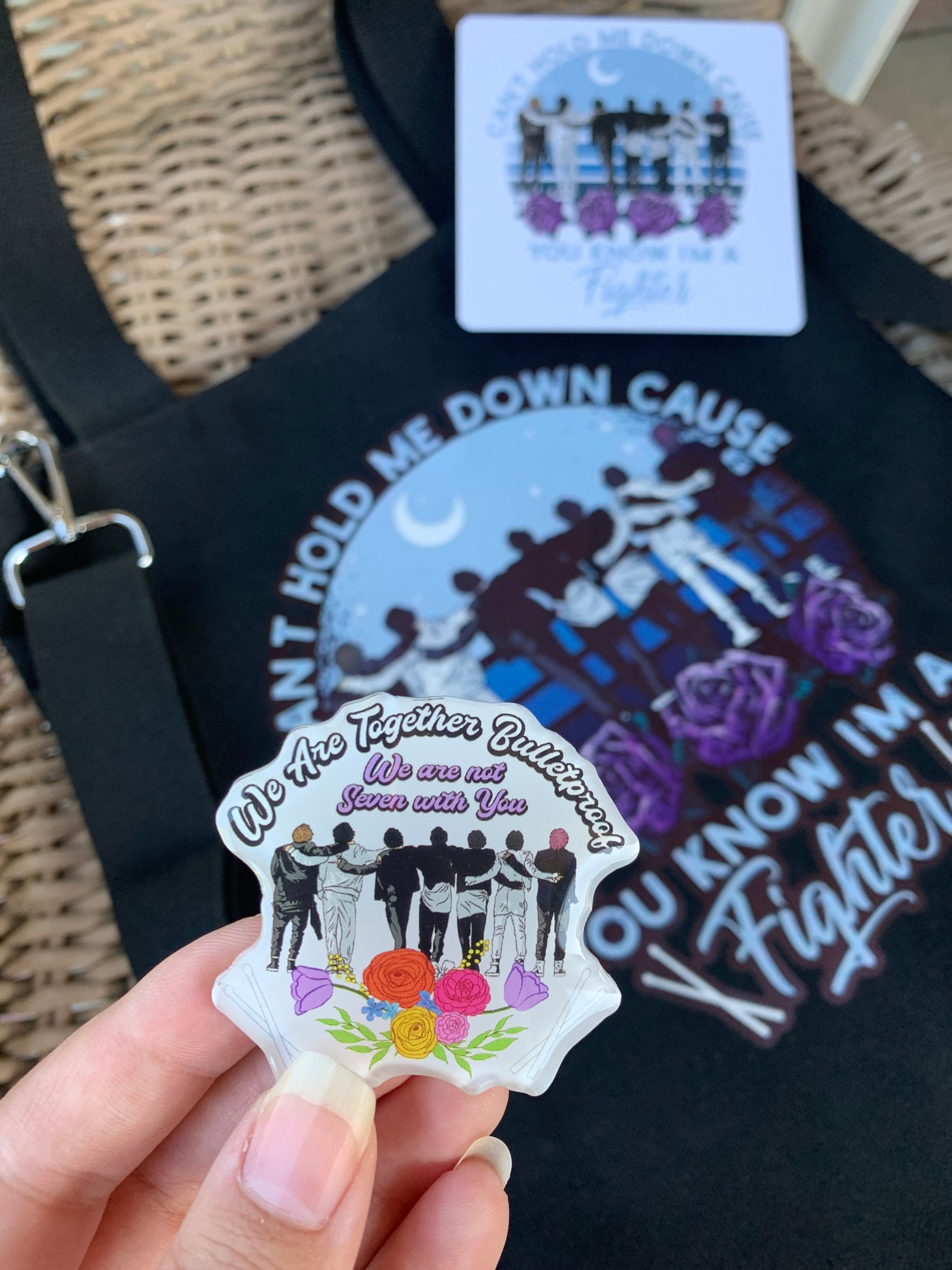 Adorable merch featuring BTS and lyrics from the song ON. The pin features lyrics from WAB the eternal. Tote bags are available in Solid Black and Vintage Black, measure 12.5 inches wide and 15 inches tall and are made from a strong/durable canvas material so you can carry heavy things without worrying about it ripping.They have a zippered pocket on the back outside of the bag and inside the bag, and 2 slot pockets. It has a zipper to close it and keep all your items safe inside and comes with an additional adjustable woven strap so you can wear it as a crossbody bag and carry heavier items easily.