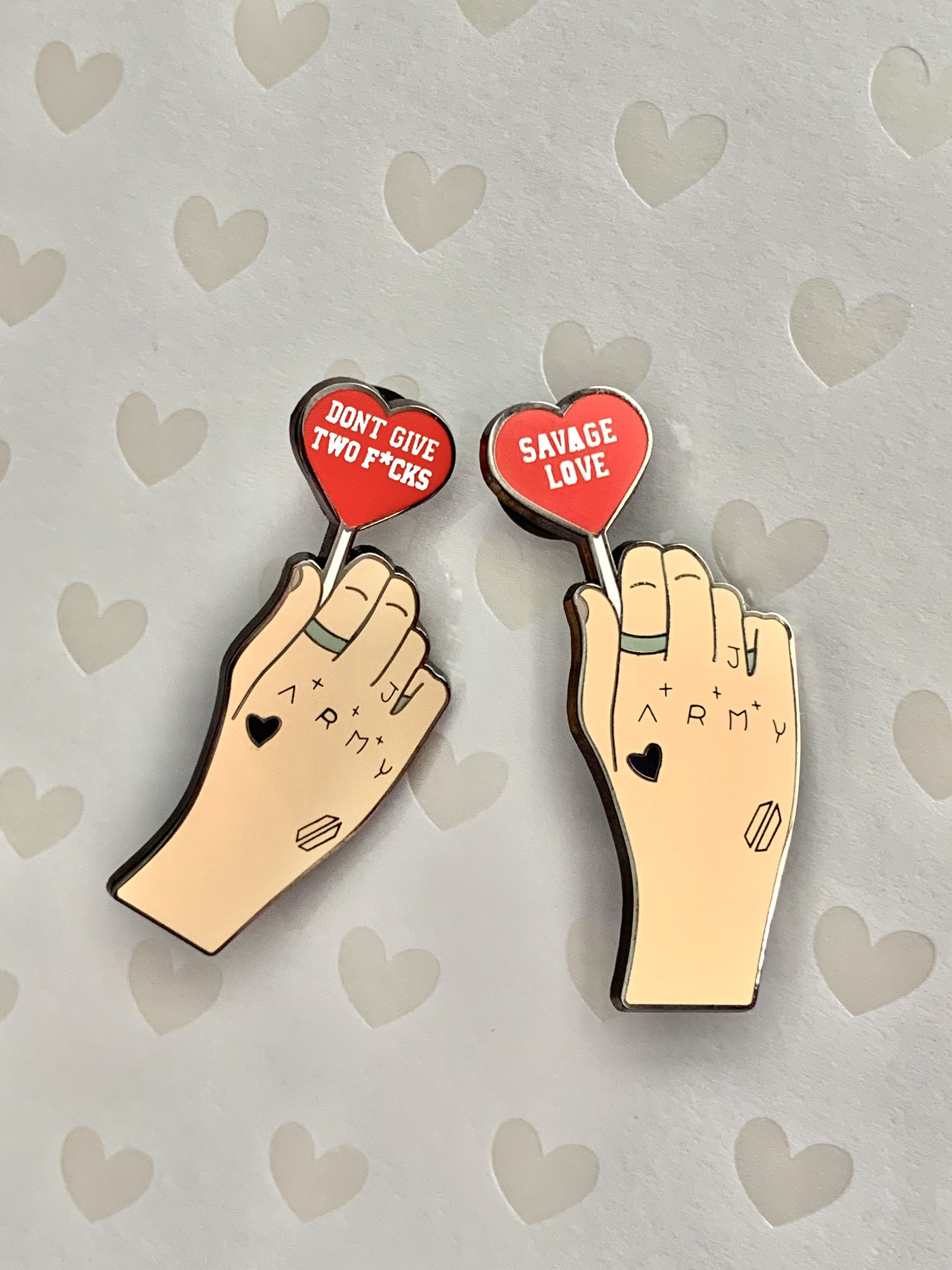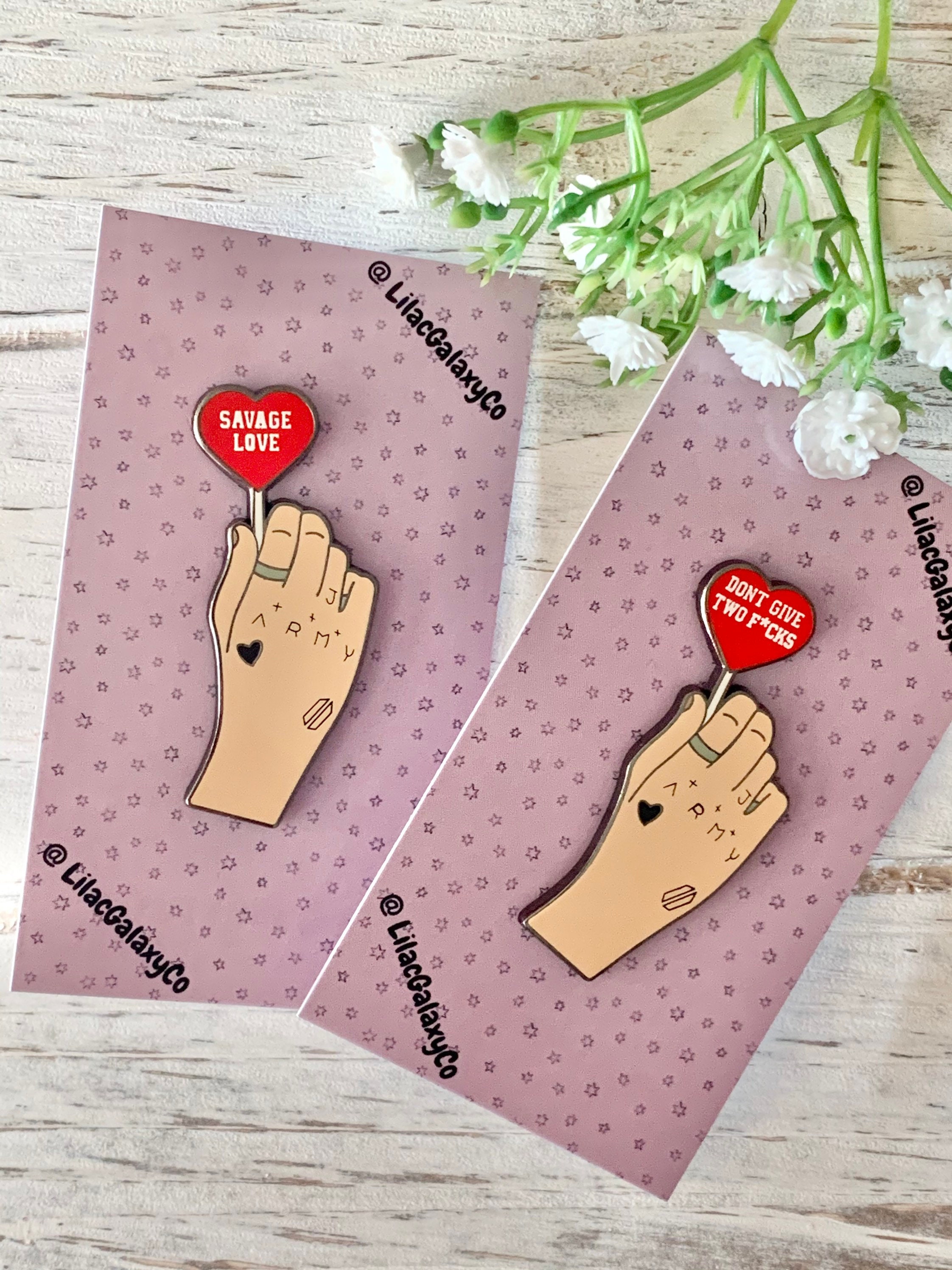 Hard enamel pin celebrating Jungkook's part in the song Savage Love. Features his hand holding a heart shaped lollipop with the option of choosing between two iconic parts of the song- "Savage Love" or "Give Two F*cks". Each pin measures about 2 inches tall Silver plating Rubber backings Shop name stamped on back.