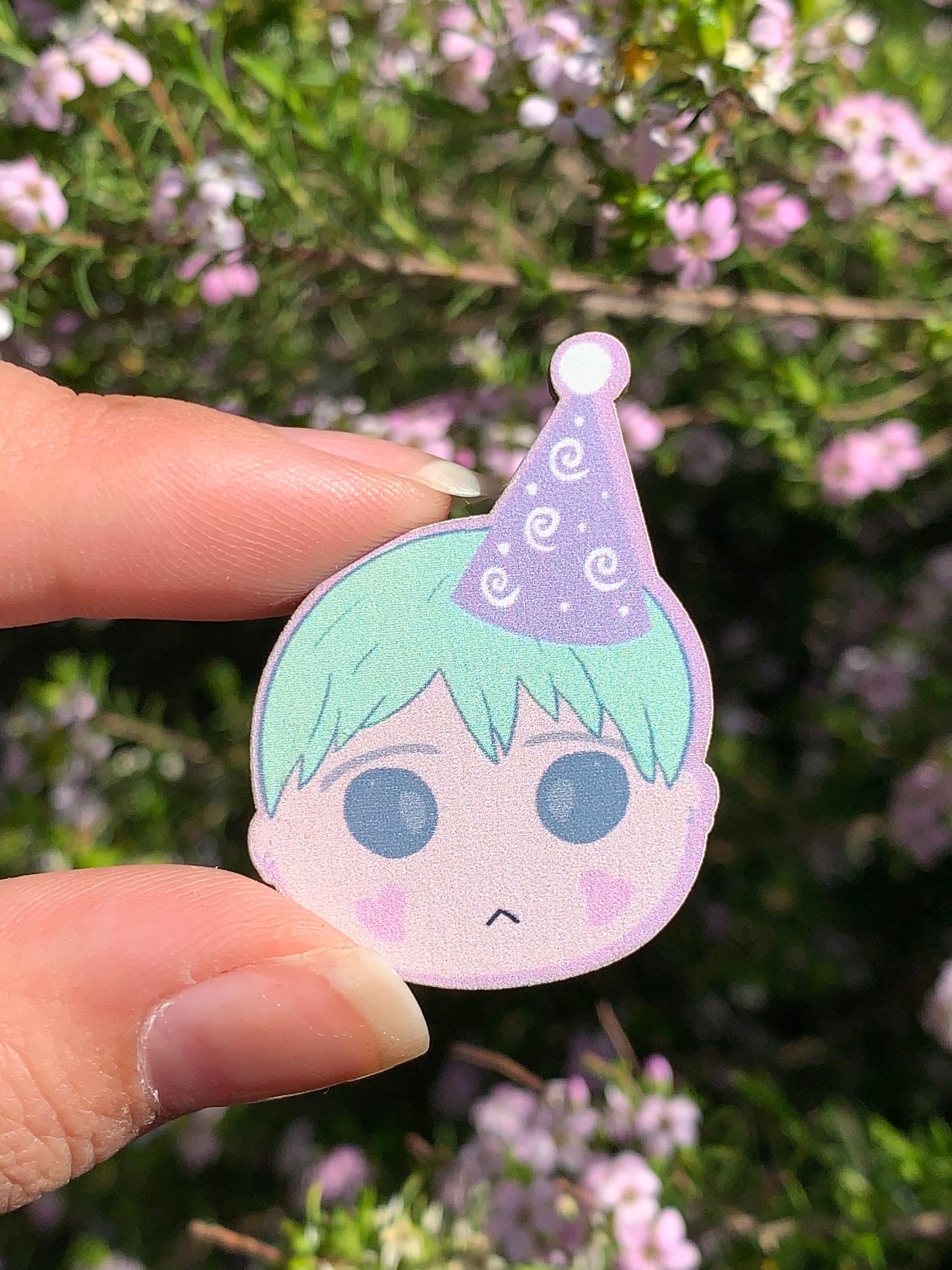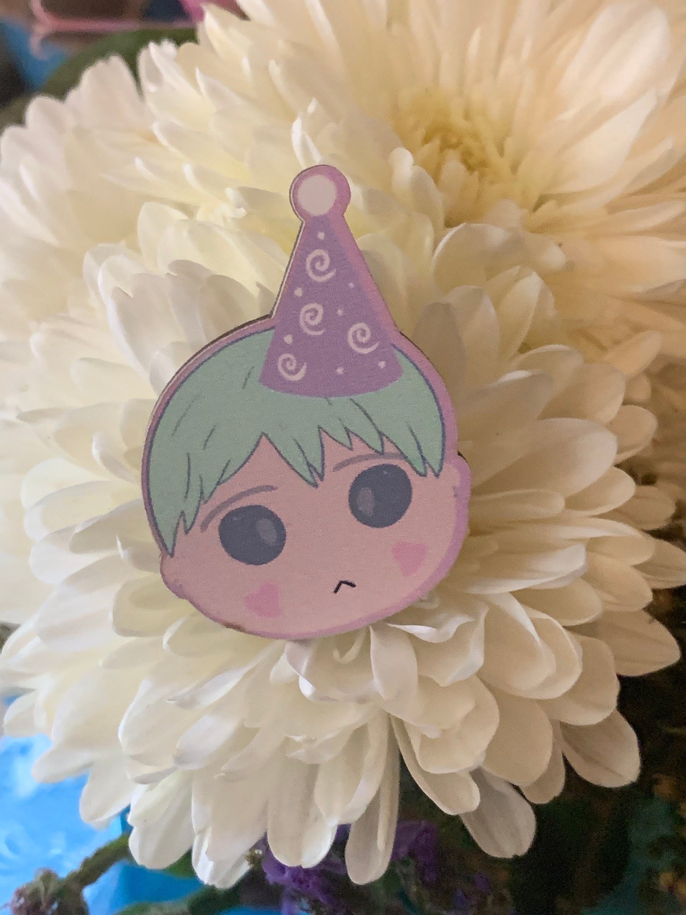 Wooden pin inspired by one of my favorite Yoongi looks! Mint Yoongi! Option of party hat Yoongi or everyday Yoongi. Measures about 1 inches tall. Silver plating Rubber backings Shop name stamped on back
